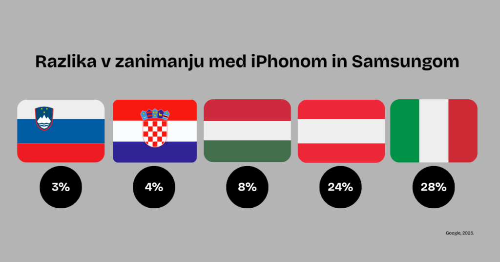 Statistika namreč razkriva, da je zanimanje za iskanja med iPhonom in Samsungom v zadnjem letu ločeno za vsega tri odstotne točke, kar je približno 80 odstotkov manjša razlika v primerjavi s povprečnimi rezultati sosednjih držav.